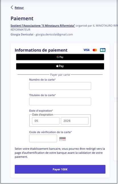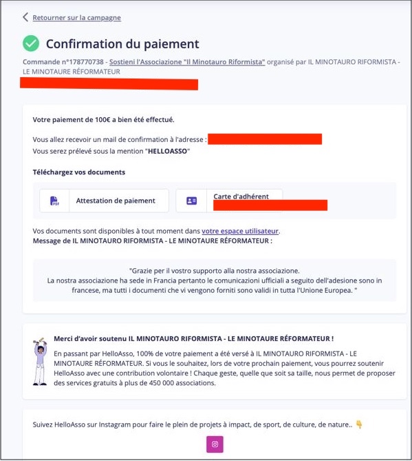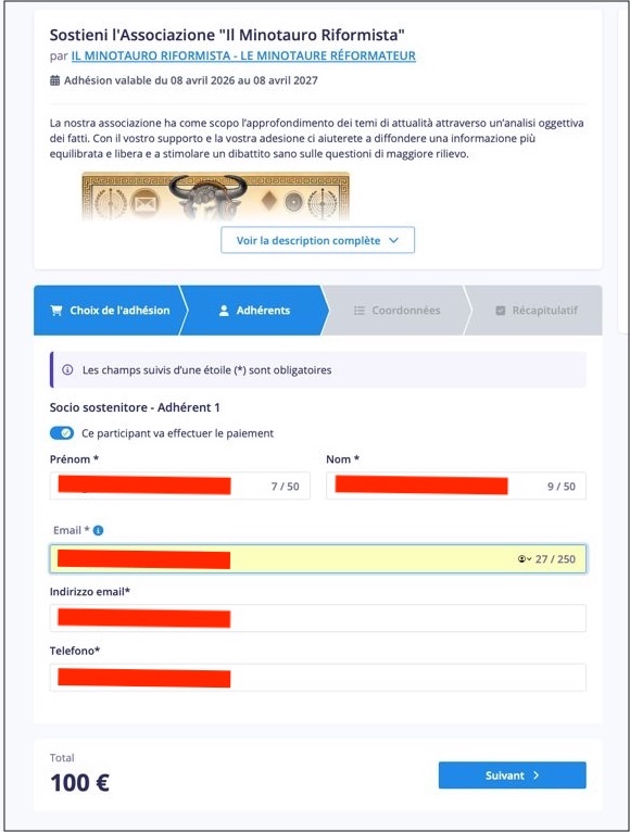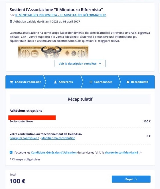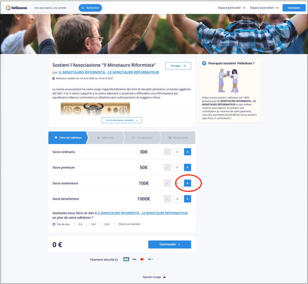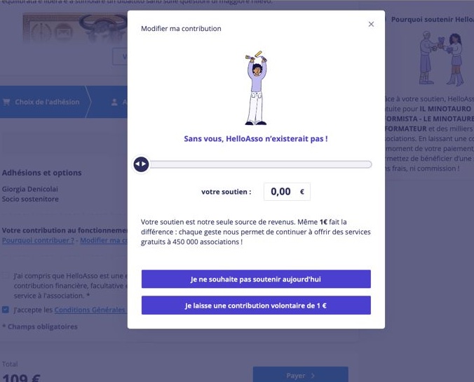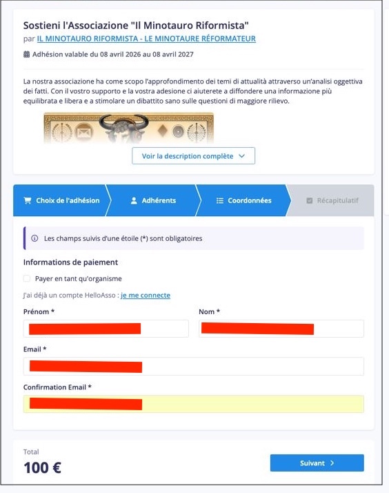 Fate semplicemente “Click” sull’immagine del Minotauro per attivare il processo. Apparirà la finestra di Helloasso, il servizio francese che ci permette di gestire gli iscritti.